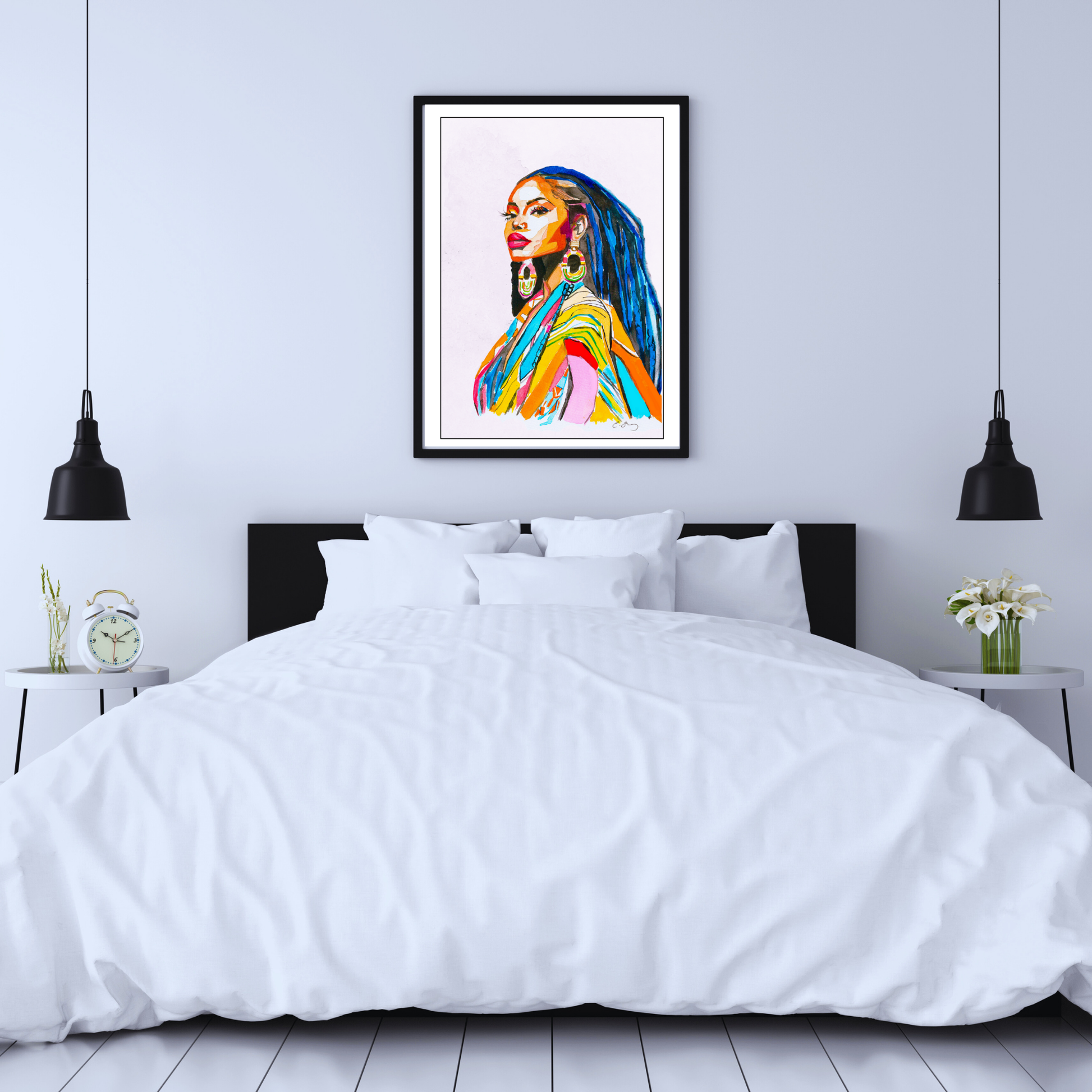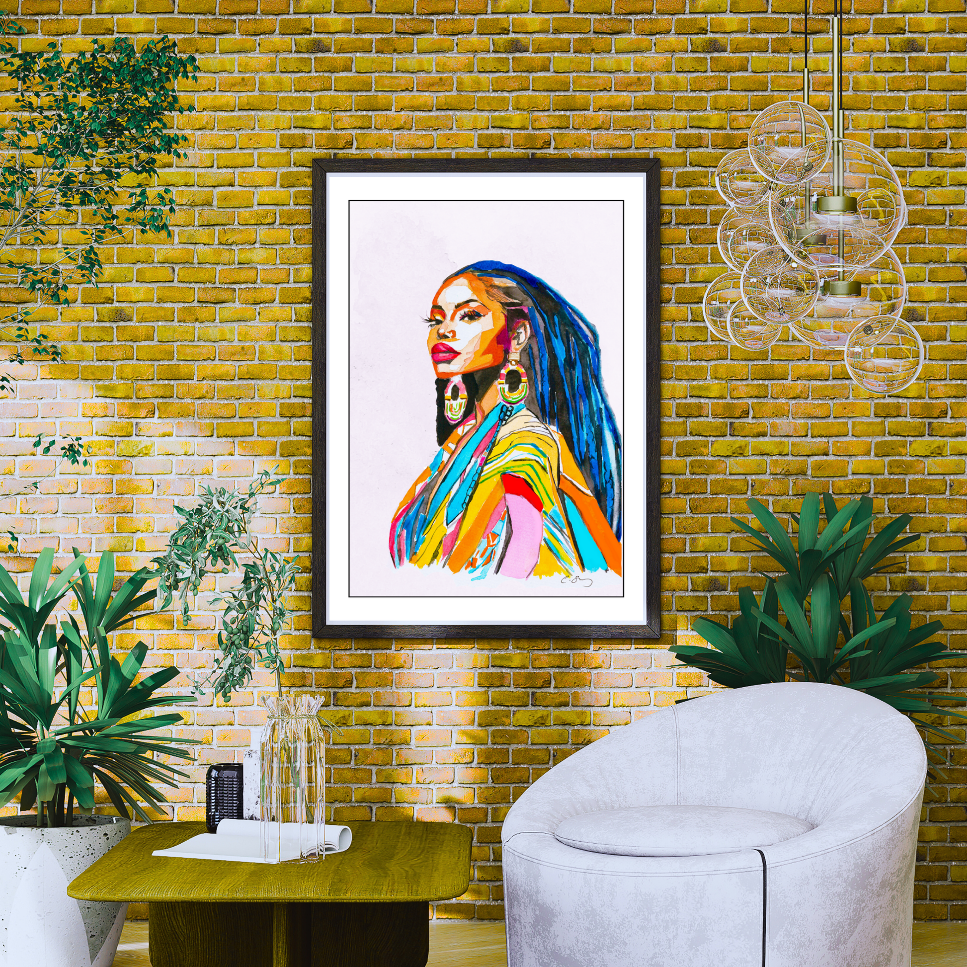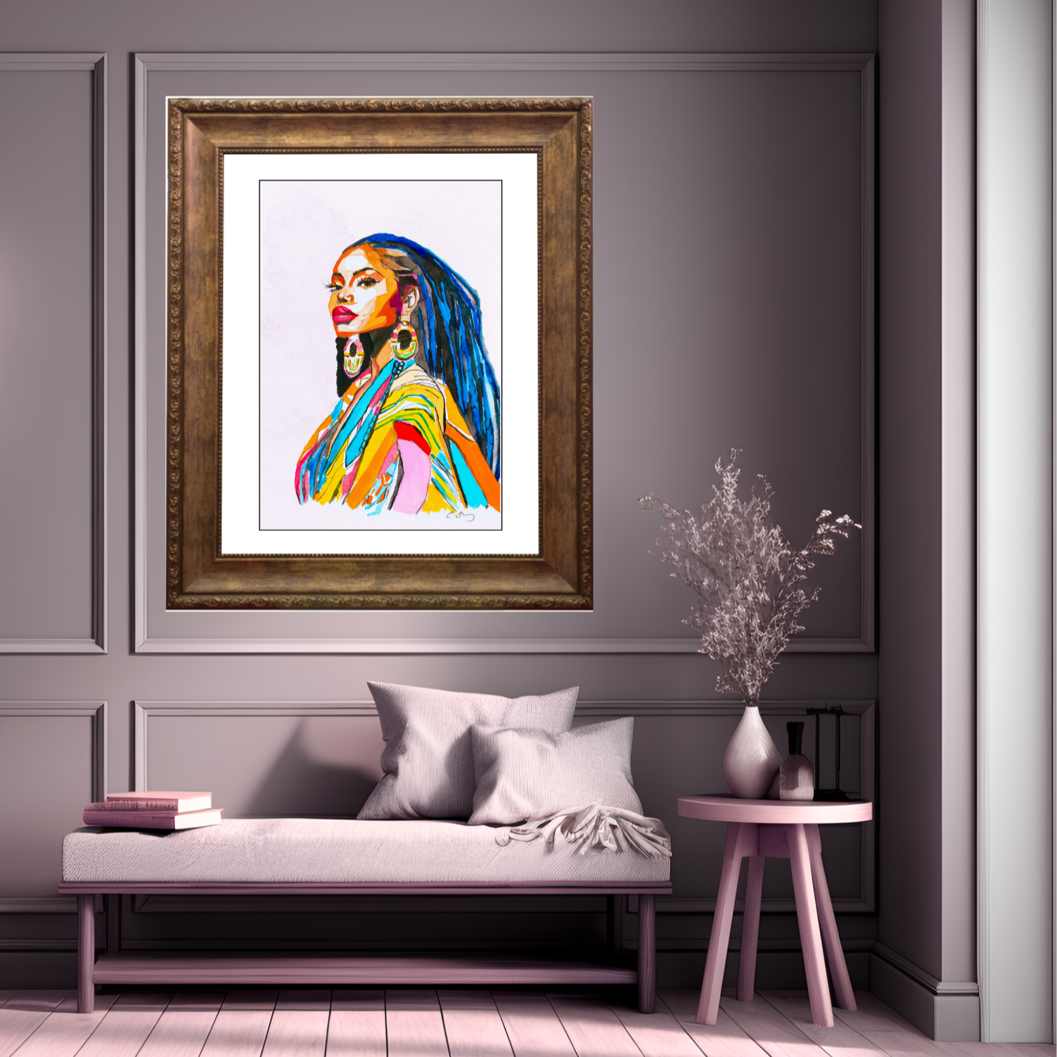 “Dignified Divinity” radiates an aura of strength and quiet wisdom, inviting us to reconnect with the power that lies dormant within. Her poised, dignified stance beckons introspection, while the vibrance of her garment represents the boldness of freedom and the unwavering confidence she embodies. She is a reminder of the boundless treasures we carry within, a wealth of courage, resilience, and potential that may have been waiting too long to awaken. She has now called forth her blissful spirit within. Her connection to the creator flows through her effortlessly with rhythm, harmony and balance. She flows like water, resistant yet yielding, shaping her world with quiet strength, never forced but always unstoppable.